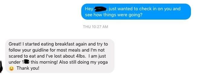 It was very thorough and walked me through so many important topics that people don’t necessarily think about when trying to change their lifestyle and lose weight! I’m now more comfortable in my own skin. I can physically do a lot more without feeling like my stomach is in my way and I now know how to nourish my body for the rest of my life using the tools that I've learned.